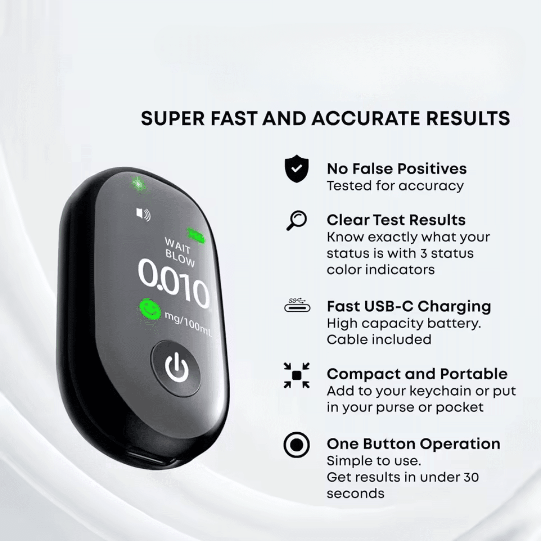 Breath Guard Buddy is a pocket-sized digital alcohol tester built for everyday users, not just professionals. It combines a sensitive breath sensor, a clear display, and a sleek, portable form factor so you can test yourself anytime, anywhere. Designed as a personal safety companion, it is ideal for nights out, parties, work events, or keeping in your car or bag as a constant check-in tool.